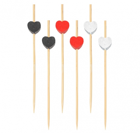 Очаровательные бамбуковые шпажки для канапе длиной 12 см с декором в форме сердца. Упаковка содержит 100 штук. Идеальное решение для свадебных банкетов, романтических ужинов и особых мероприятий. Полностью безопасны для контакта с пищевыми продуктами.