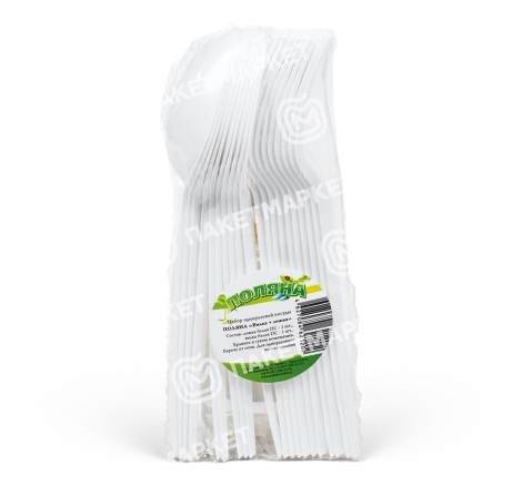 - Состав набора одноразовой посуды «Вилка + Ложка»: вилка столовая (х10шт), ложка столовая (х10шт).