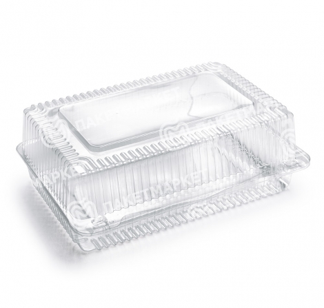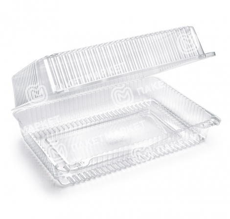 Контейнер-ракушка объемом 3000 мл изготовлен из прозрачного ПЭТ-материала. Имеет прямоугольную форму с плотно закрывающейся крышкой, обеспечивающей герметичность и удобство хранения продуктов.