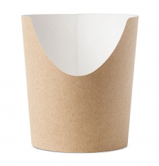 Упаковка для картофеля фри изготавливается, как правило, из плотной бумаги или картона. Она позволяет сохранить в чистоте руки и одежду и при этом не портит аромат и вкус жареных картофельных ломтиков. Иногда для большей жиростойкости материал берут ламинированный. Но всё-таки чаще в целях снижения себестоимости используется именно обычная бумага с высокой плотностью.
