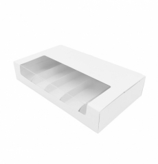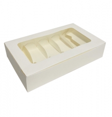 Ещё один востребованный вид упаковки — коробки для эклеров. Экологичная картонная тара с прозрачным окном предохраняет нежные пирожные и в то же время демонстрирует своё аппетитное содержимое. Коробки рассчитаны на 5 пирожных, но при необходимости вы можете дополнительно заказать вкладыш на четыре штуки.